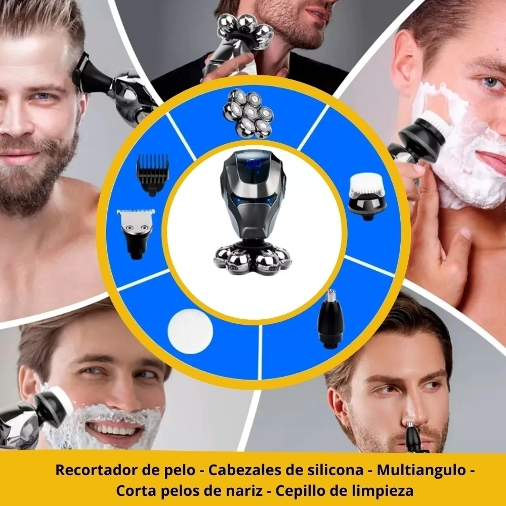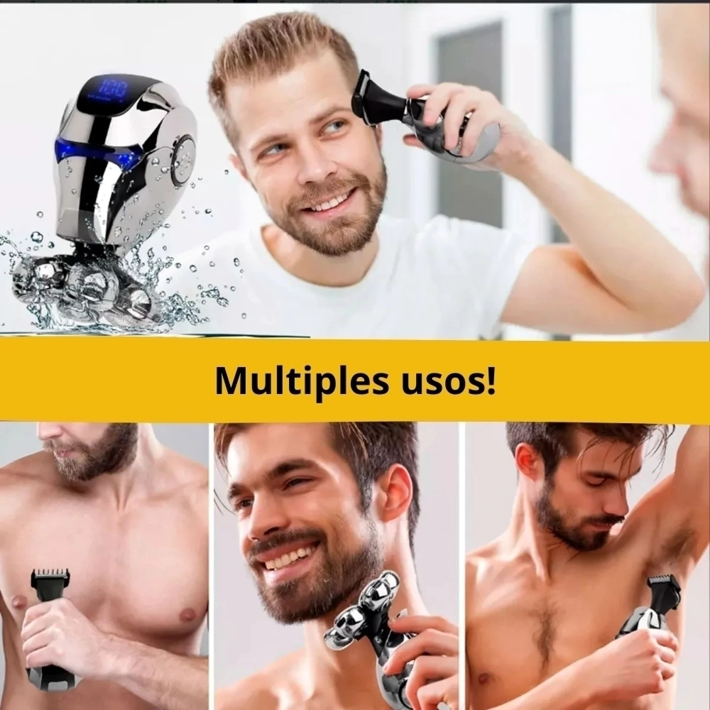 Máxima versatilidad: disfruta de una comodidad de aseo como nunca antes con nuestra afeitadora multifuncional a prueba de agua. Diseñada para satisfacer diversas necesidades de aseo, desde el afeitado de precisión hasta los cortes de pelo, el recorte del vello nasal e incluso los masajes faciales, en un solo dispositivo elegante.